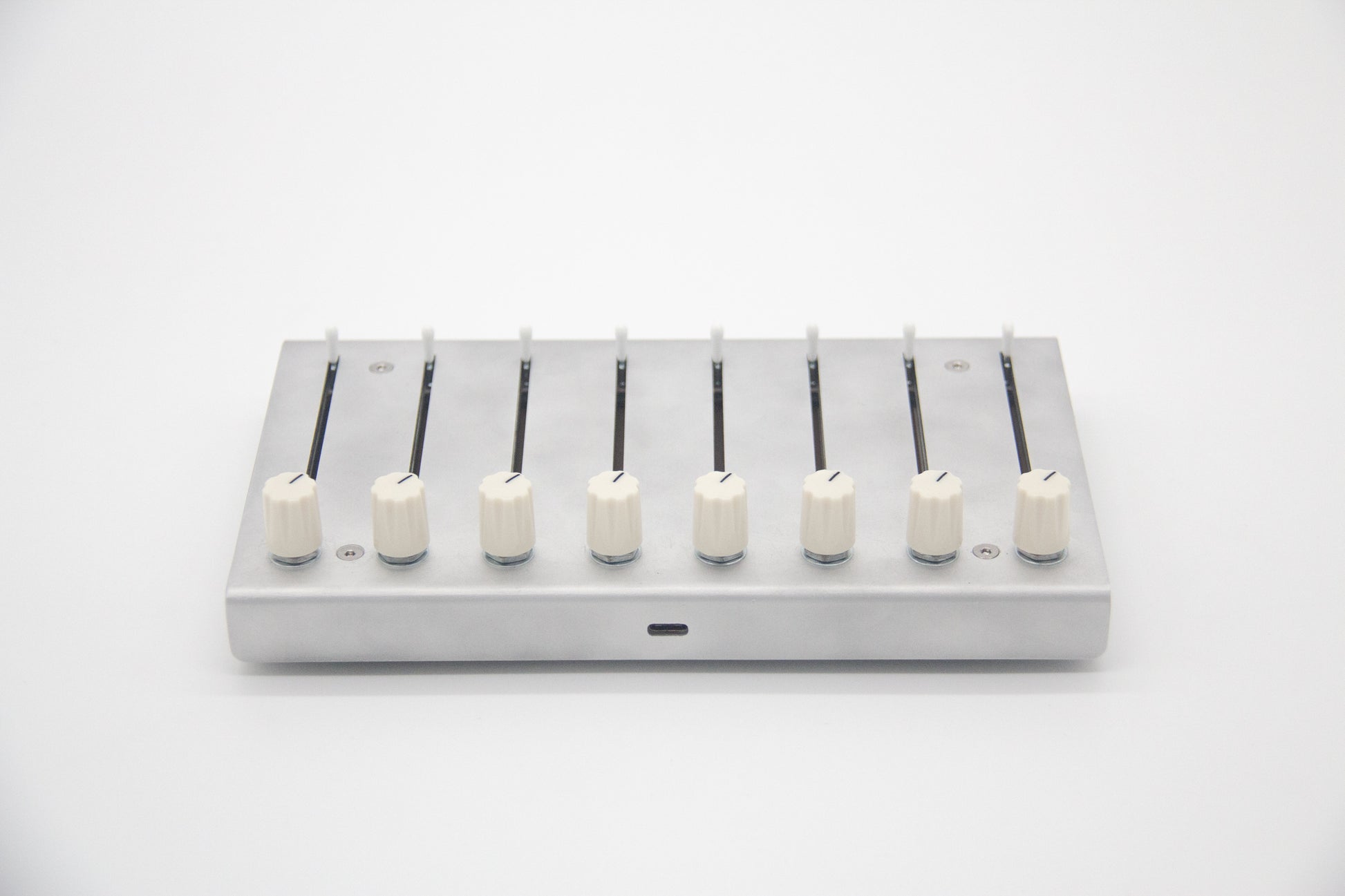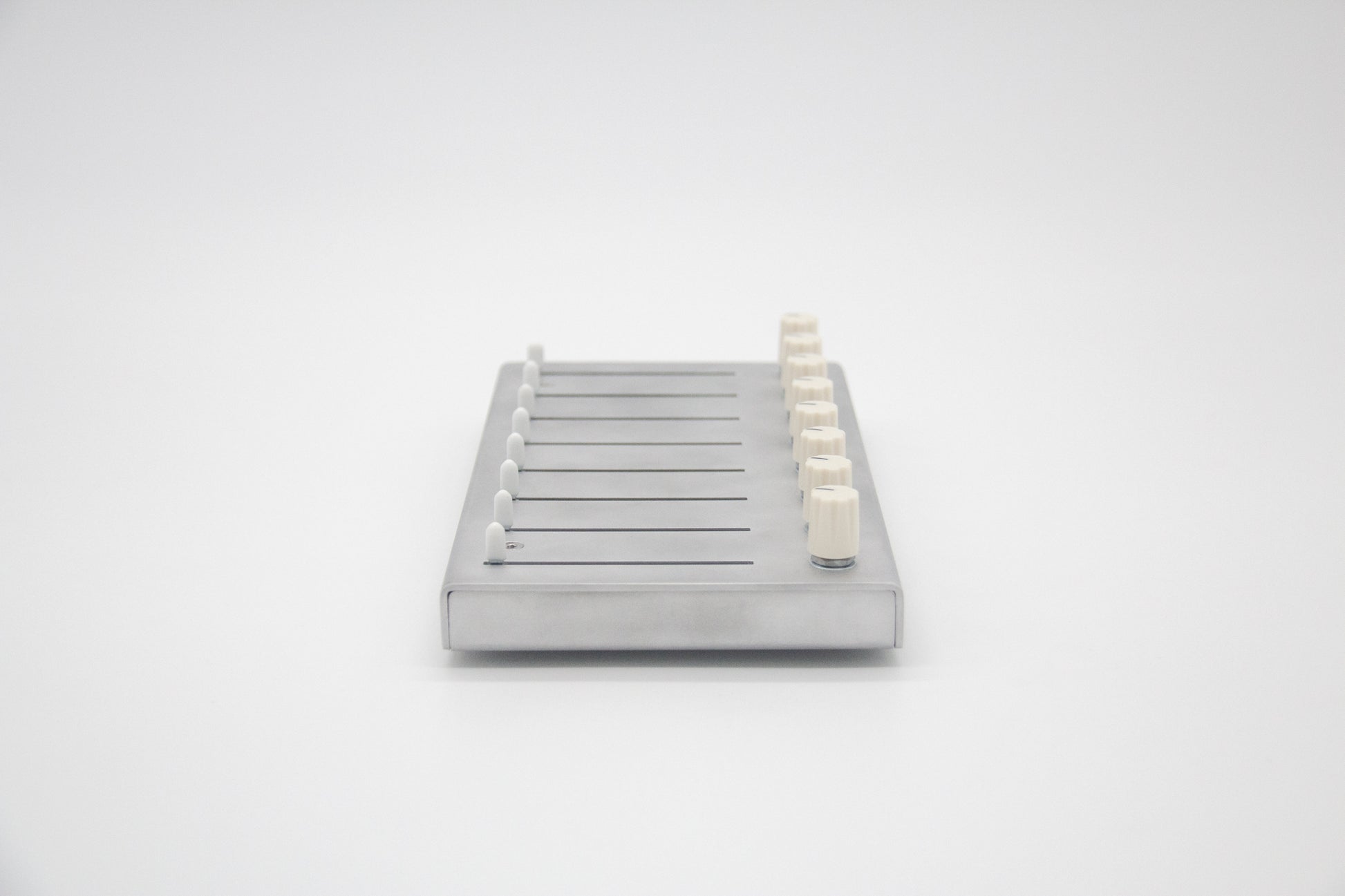 miniMidi is a minimalist controller that sends midi data from eight knobs and eight sliders through USB, giving physical control over parameters in digital software.